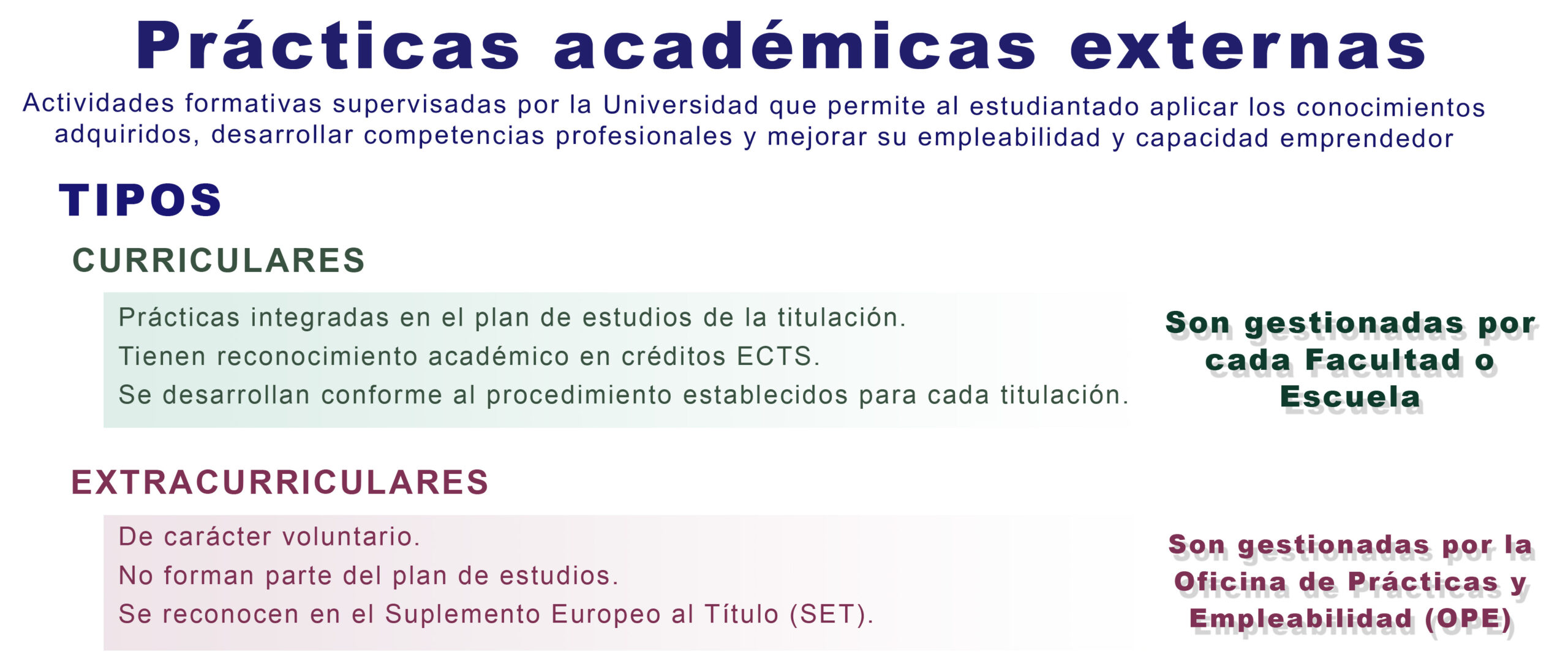 Desde la Oficina de Prácticas y Empleabilidad, se gestionan las prácticas EXTRACURRICULARES. Si lo que necesitas es información sobre las prácticas curriculares (asignaturas de tu plan de estudios) ponte en contacto con la persona responsable en tu facultad o escuela.
