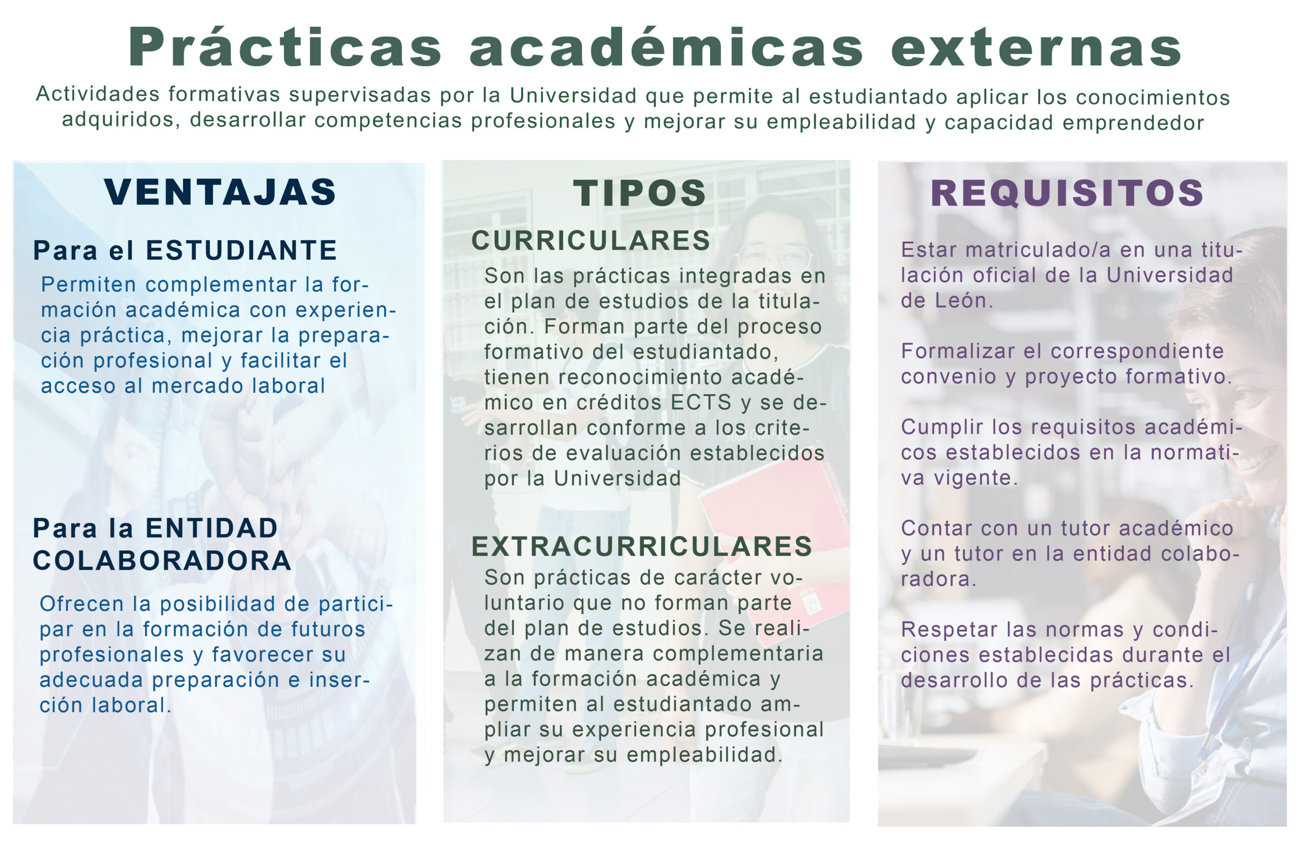 Las prácticas académicas externas de los estudiantes universitarios están reguladas por el Real Decreto 592/2014, de 11 de julio. En la Universidad de León, están reguladas por el Reglamento por el que se regulan las Prácticas Externas en los estudios de Grado, Máster y Doctorado, aprobado por Acuerdo de Consejo de Gobierno de 02/10/2014.